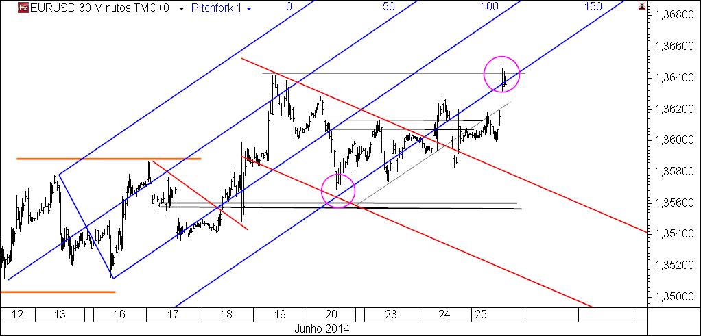 Já vimos a "importância" da linha rosa (não me canso de dizer: desenhada com pouco ortodoxia e com antecedência assinalável em relação ao efeito que se procurava demonstrar)). Agora está na hora de ver se ela nos poderá continuar a ajudar, dado que aparenta ter uma "boa frequência". Se copiarmos essa linha para o pivot seguinte, o que é que acontece? Ficamos com algo que se assemelha a um canal, mas que está nos antípodas dos canais. E se fizermos o mesmo para o pivot inerente ao último low, ficamos com o quê? Ficamos com o nosso já conhecido conjunto de action-reaction lines (as above, so below).