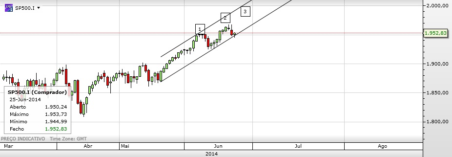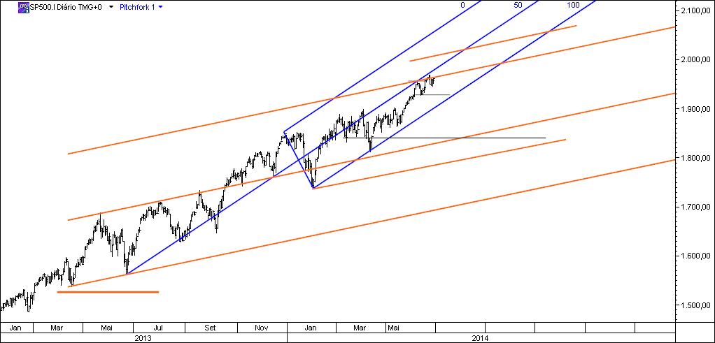 Por fim, a retração de ontem parou nos 50% Fibonacci e tem projeção a 1981.34 (161.80). Se se considerar o seguinte número Fibonacci (261.80), a cotação bate no topo do canal ascendente.
