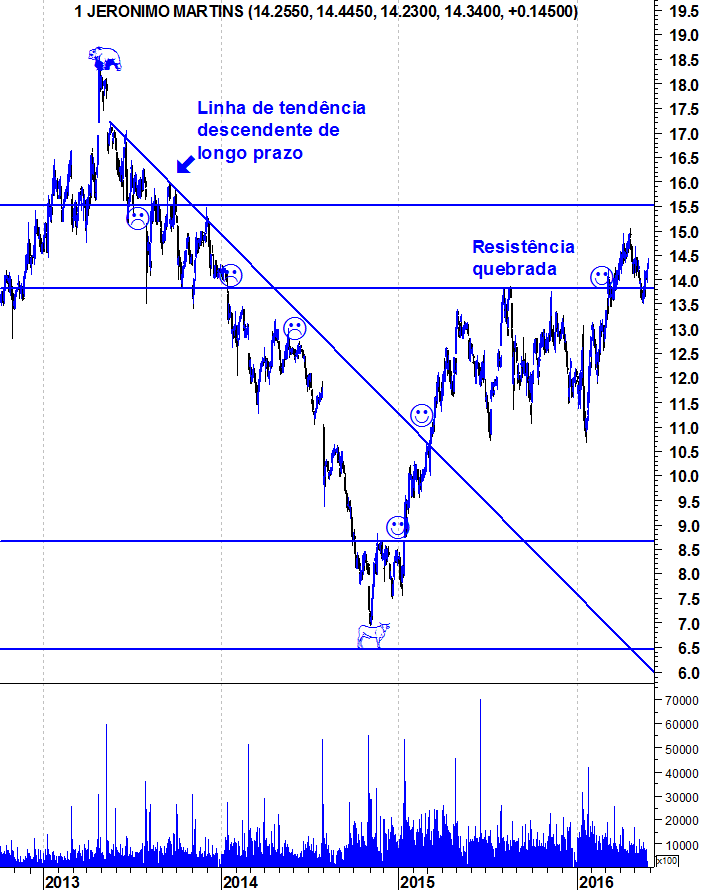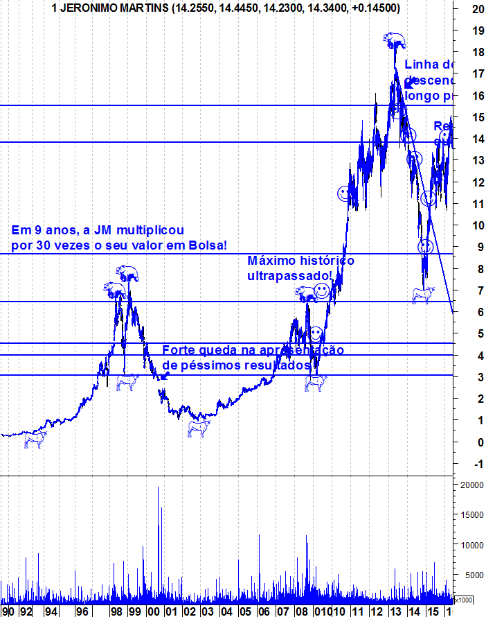 Na bolsa portuguesa são poucas as acções que estão em tendência ascendente, ou Bull Market, sendo a Jerónimo Martins uma delas. Como se verifica no gráfico abaixo, em Novembro de 2014, quando a Jerónimo Martins ressaltou do mínimo relativo um pouco abaixo dos 7€, iniciou o seu Bull Market que se mantém ao dia de hoje.
