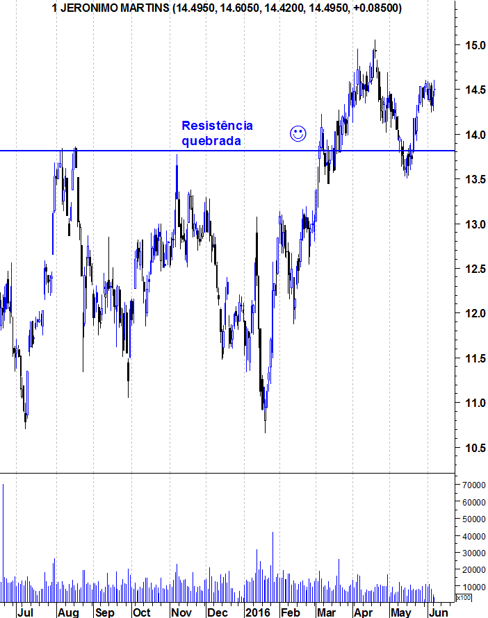 Em cerca de um ano e meio a Jerónimo Martins mais do que duplicou o seu valor, atingindo os 15€ em Abril deste ano. Ao longo do tempo os 13€ revelou-se uma zona importante nesta acção, servindo já de suporte e resistência por diversas ocasiões.