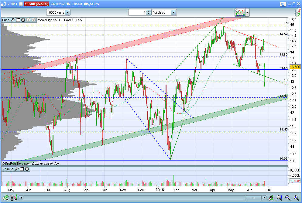 Caso este suporte dos 13€ seja quebrado, o melhor a fazer será ficar numa posição neutra e ficar atentos aos próximos desenvolvimentos. Se o preço voltar acima dos 13€, boas notícias para os compradores, ou touros. Caso contrário, devemos concentrar-nos no suporte de 10,7/10,8€ e mais importante ainda no suporte dos 10,4/10,3€. Este ultimo suporte sim, na minha opinião marca a separação entre o Bull e o Bear Market. Se existir uma quebra dos 10,3/10,4€, a Jerónimo Martins entrará provavelmente em Bear Market.