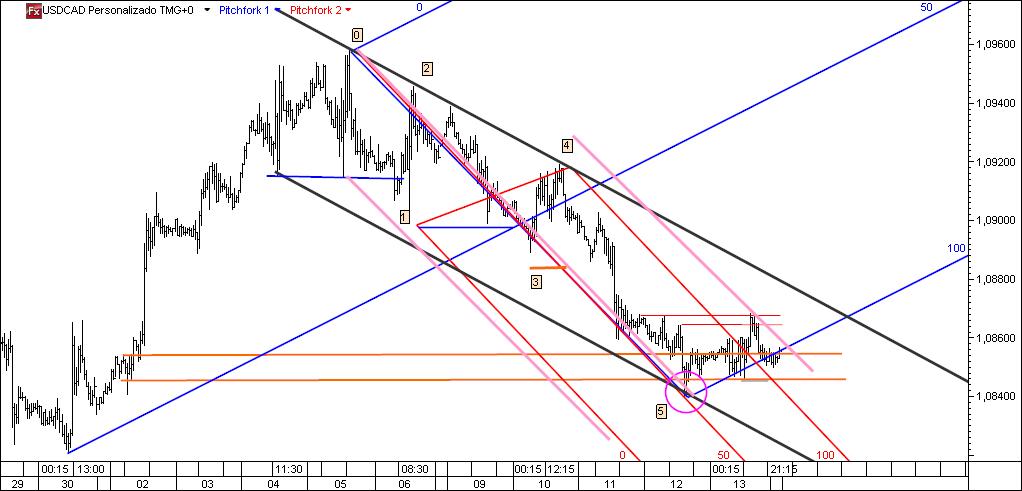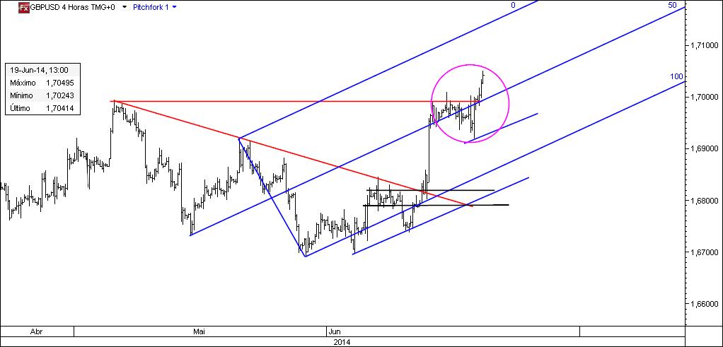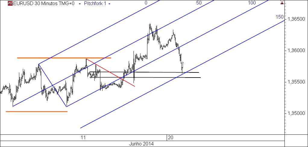 Dada a reacção ao toque na linha rosa e verificando-se a reacção do preço à median line do fork descendente, podemos dizer, com alguma segurança, que temos frequência. E se juntarmos um fork ascendente, constata-se que a linha que une os pivots B e C deste tem a mesma inclinação que a median line do fork descendente, o que nos torna ainda mais seguros de tal afirmação.