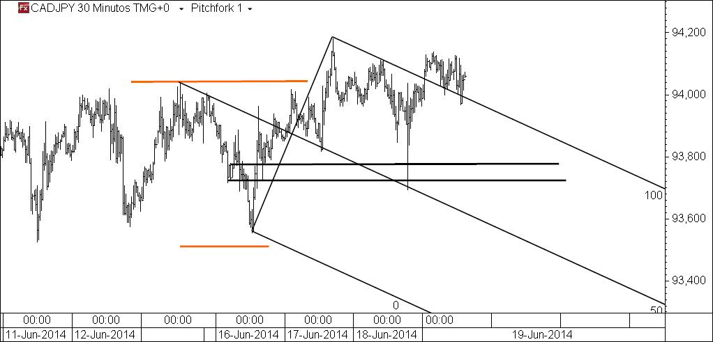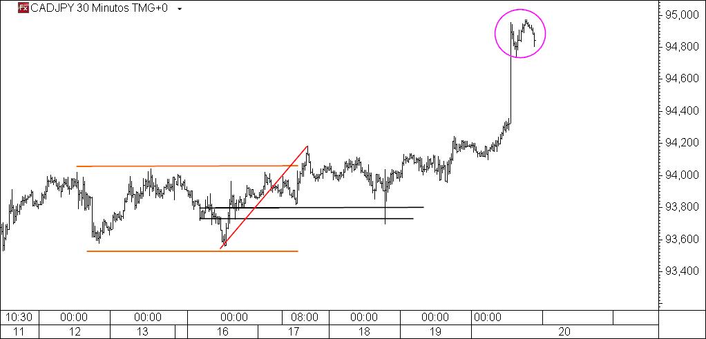 Delineei uma oportunidade especulativa no cadjpy 30 m tendo por base um padrão repetido até à saciedade. O preço não se dignou regressar à área que me interessava (como não corro atrás do preço compro em pullbacks) e a oportunidade não se concretizou. Em anterior post sugeri que a entrada poderia ter sido antecipada, sempre na observância das regras que elegi para a especulação (r:r de pelo menos 1/3, colocação de stops atrás das baleias, etc.), mas ainda não cheguei a uma conclusão segura.