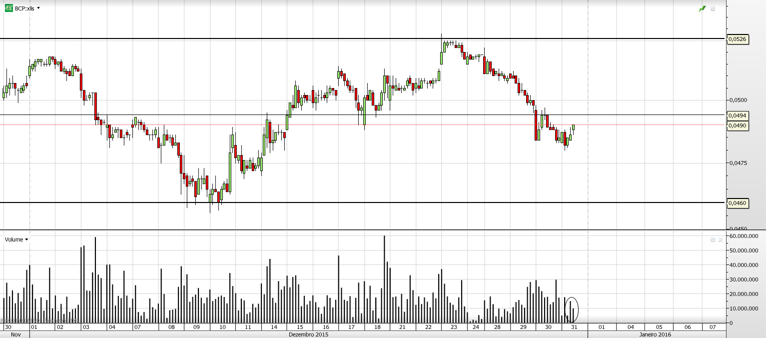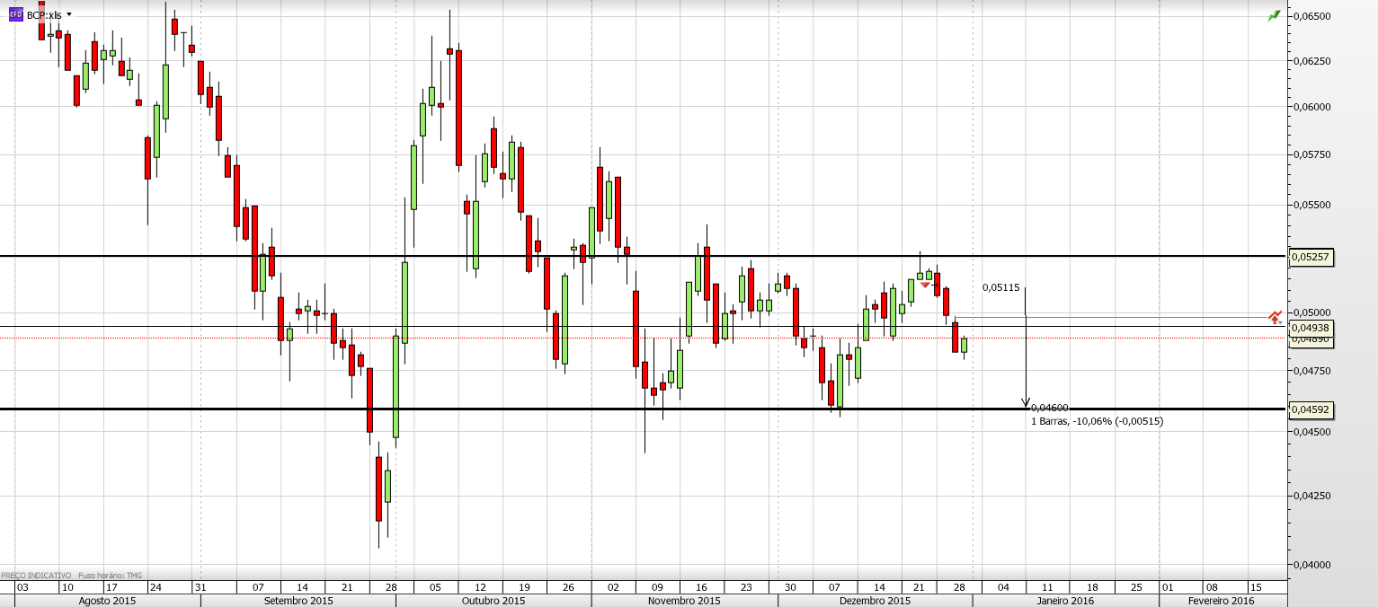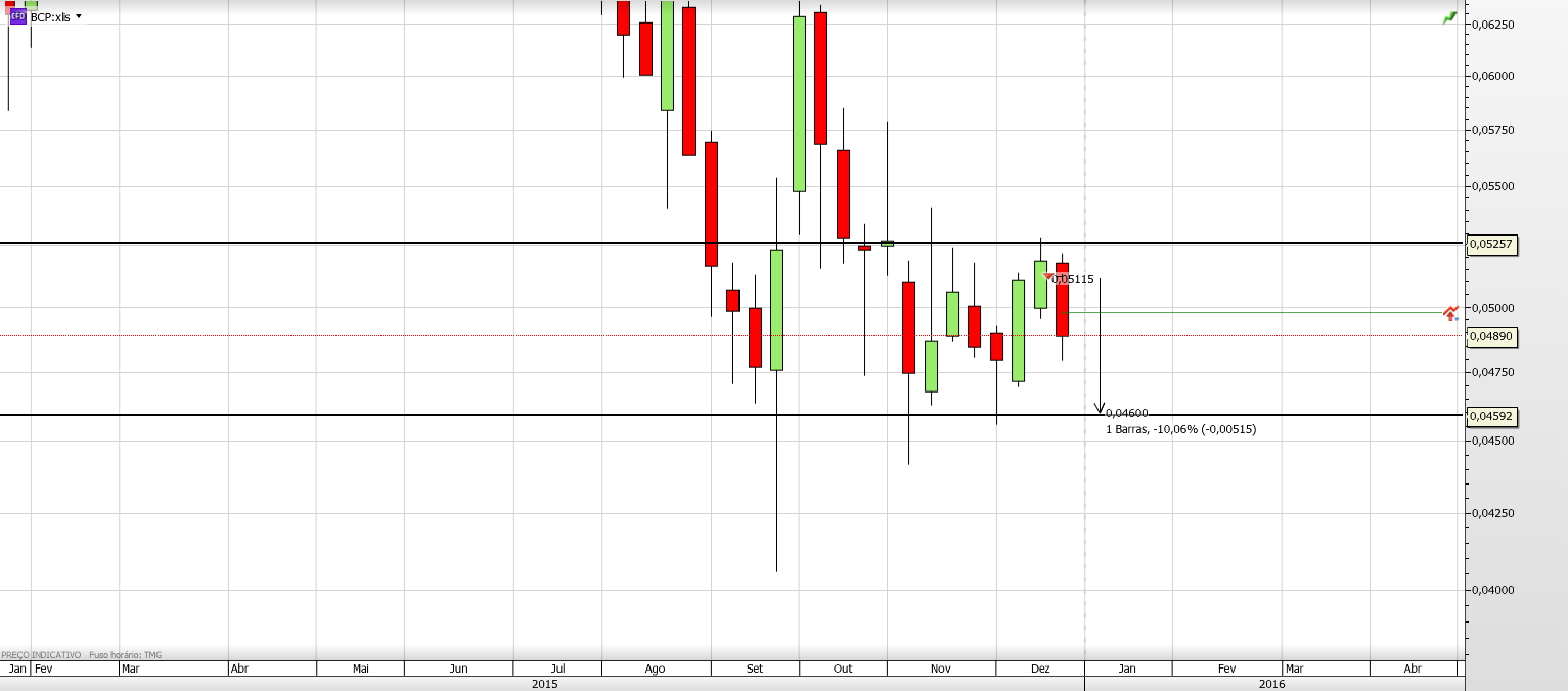 A reação do Bcp numa zona de suporte secundário para já é normal, pode ver-se no gráfico a 1H que a retração está a ser feita com volume fraco, indicação de que pode ser apenas uma retração e nada mais, espero que volte ás quedas a partir do ponto onde está, pode ir no máximo até aos 0.049. O outro cenário que penso ser menos provável é inverter o movimento descendente a partir daqui. No semanal a ultima vela reforça a continuação das quedas, veremos.