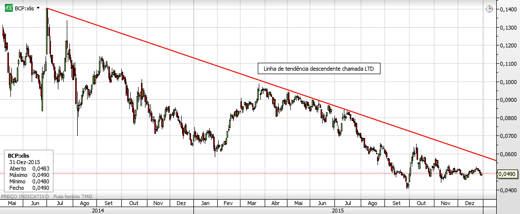 tiagopt2 Escreveu:investpouco Escreveu:tiagopt2 Escreveu:A análise ao BCP levar-nos-á novamente a percorrer um cenário de esperança e incerteza. Começando pelas más notícias, a força ascendente do título não tem sido suficiente para quebrar a sequência de lower-highs que se arrasta desde Abril. São, a olho, 11 consecutivos. É incorrecto considerar que a tendência do BCP deixou de ser descendente numa óptica de médio prazo enquanto esta sequência se mantiver inalterada. Por outro lado, e ao contrário do que se passa no BPI (onde o movimento descendente tem aspecto de consolidação), neste caso tudo indica que estaremos perante um canal paralelo descendente. O número de toques nos extremos ultrapassa o que seria expectável para um padrão de consolidação... A somar a isso, temos o preço a encostar a uma zona de alguma resistência, o que pode gerar um movimento descendente.