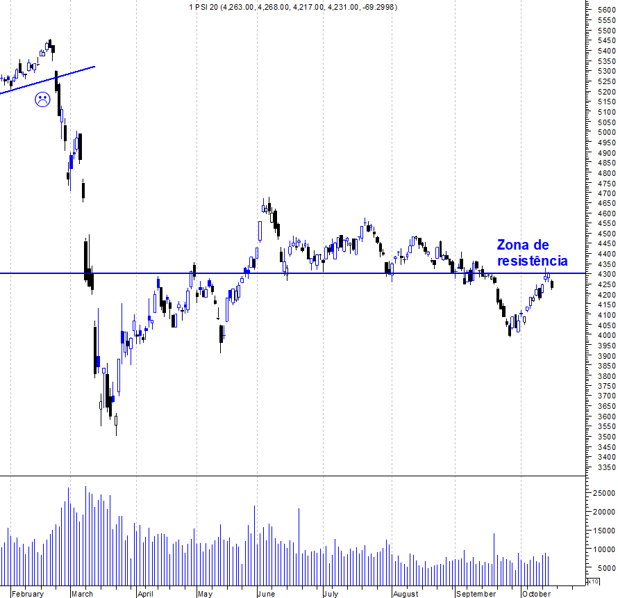 Aqui fica o gráfico actualizado depois do PSI ter corrigido em cima da resistência que, cada vez mais, continua a provar a sua força e a ser um marco importante caso um dia o mercado inverta.