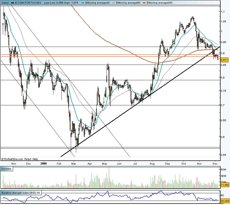 Quanto a suportes acho que estamos neste momento a testar o suporte dos 0,85 pois durante varias vezes este valor foi considerado uma grande resistencia (dez 08, jan 09, maio 09 e em 14-agosto-09 a quebra da mesma).