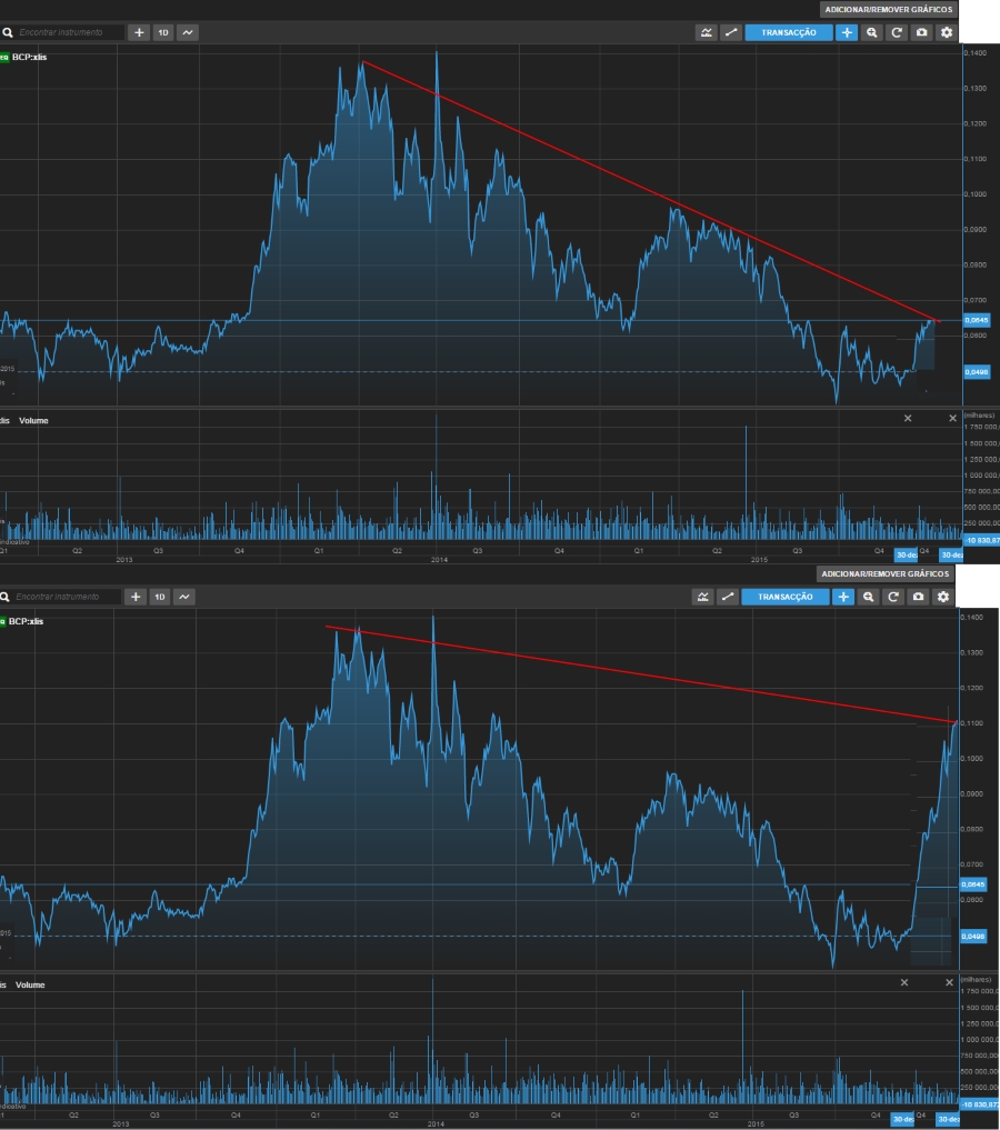 Os gráficos e as cotações é a mesma coisa, já reparaste nisso?! Eu não olho para a tendência para me dar jeito mas antes para definir que posicionamento devo ter num determinado título... obviamente não exclusivamente do BCP, todos os dias olho para os gráficos de dezenas de títulos!