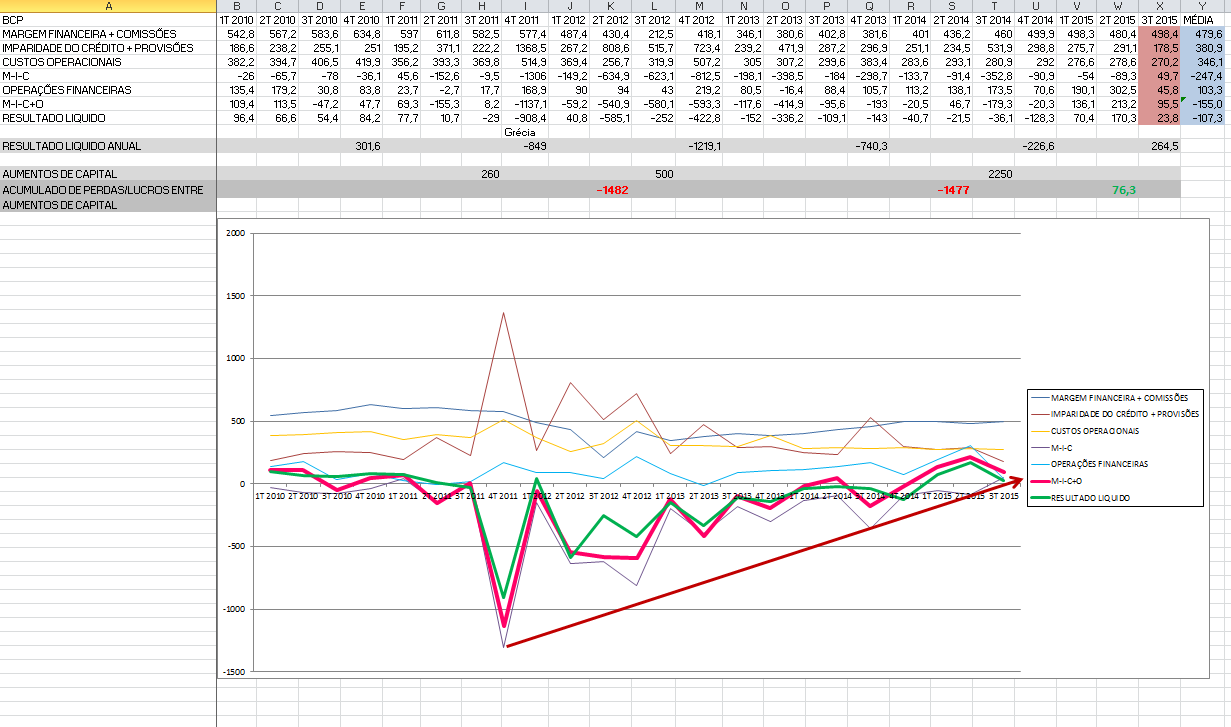 EDIT: No AC de 2012 os acionistas meteram no BCP 1,25 mil milhões, no de 2012 já não me lembro. Depois disso ainda fizeram uma operação de troca de obrigações por ações, ou seja, para todos os efeitos foi mais um AC (embora de dimensão relativamente pequena)... O BCP vale neste momento cerca de 3 mil milhões de euros em bolsa, se retirarmos a este valor aquilo que os acionistas lá meteram só de 2012 para cá sobrará quanto? meia dúzia de tostões! O BCP tem sido uma máquina de queimar dinheiro!