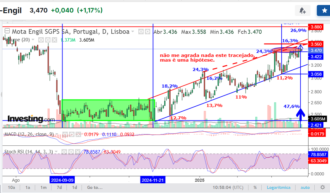 Rafael Abreu Escreveu:J.f.vieira Escreveu:A partir de hoje, estou a orientar a carteira de um amigo que me pediu auxílio. Hoje vendi ações da Teixeira Duarte por 0,1545€ e adquiri ações da Mota‑Engil por 3,41€. A decisão foi tomada com base numa análise detalhada do mercado, tendo em conta o potencial de valorização a longo prazo de ambas as empresas.