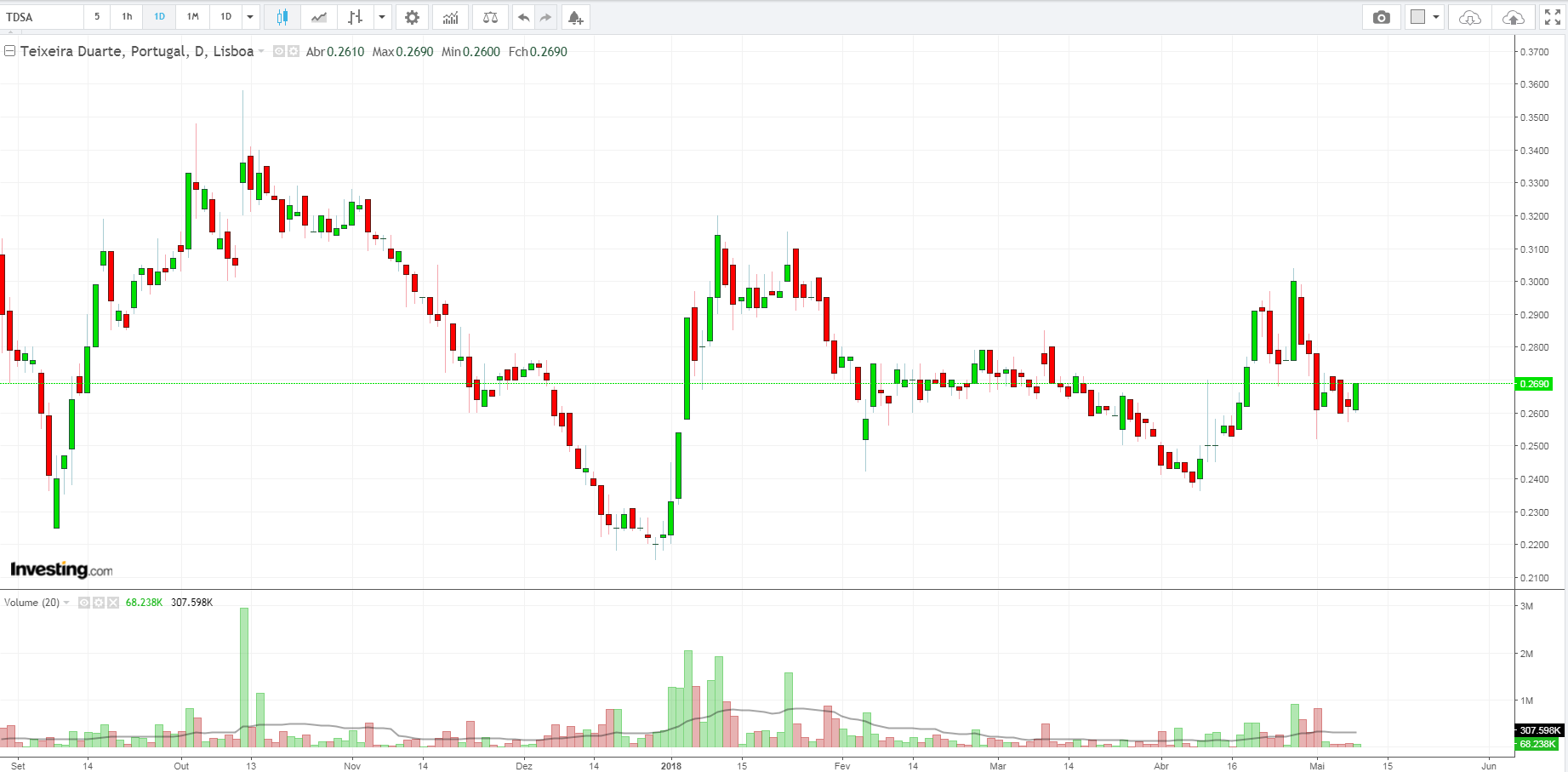 Não me chocaria se no curto prazo fosse visitar novamente o suporte, no entanto o ideal seria efetuar um higher low (pelos 0.25/0.26), voltando a ir à resistência no seu curto prazo, preferencialmente até à divulgação da data e valor do dividendo.