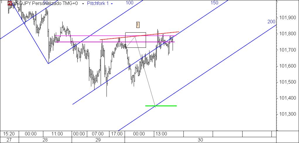 Quem, como eu, tem por hábito circunscrever a atenção a um conjunto predeterminado de mercados (só assim se poderá começar a ganhar a intimidade necessária ao conhecimento das matreirices de cada um deles), tem de ter especial cuidado com o modo como faz os seus desenhos nos respectivos gráficos. É que facilmente se fica preso à leitura que se tenha feito numa 2.ª feira à noite e entretanto já chegámos à 5.ª feira. Assim, e por exemplo, se naquela data se equacionava um certo tipo de negócio, pode suceder que a evolução do preço venha entretanto mudar a configuração do mercado. Ora, se nos mantivermos fiéis às linhas que de início desenhámos, não só ficamos fechados a outras oportunidades, como passamos grande parte do tempo à espera que o mercado faça aquilo que queríamos que fizesse (que bata nas linhas ou chegue às zonas) e não conseguiremos detectar que ele assim não irá fazer, pelo menos do modo previamente suposto (ex. chegar com certa velocidade a certo nível, em certa data, etc.). A situação torna-se cada vez mais grave quanto menor for a escala temporal usada, dado que pelo mero decurso do tempo uma linha ou uma zona rapidamente são ultrapassadas. A única solução para este problema é apagar tudo e começar de novo. Eis pois um novo gráfico do usdjpy a 20 m, onde se poderá ver que o mercado está em fase descendente (lembre-se que se tinha vindo a perseguir uma compra). A fraqueza do preço é evidente na medida em que, depois de ter quebrado a linha média inferior do fork, não fez o teste (switchback) e dela tem vindo a afastar-se e entretanto fez um novo mínimo. Teremos pois uma oportunidade especulativa vendedora.