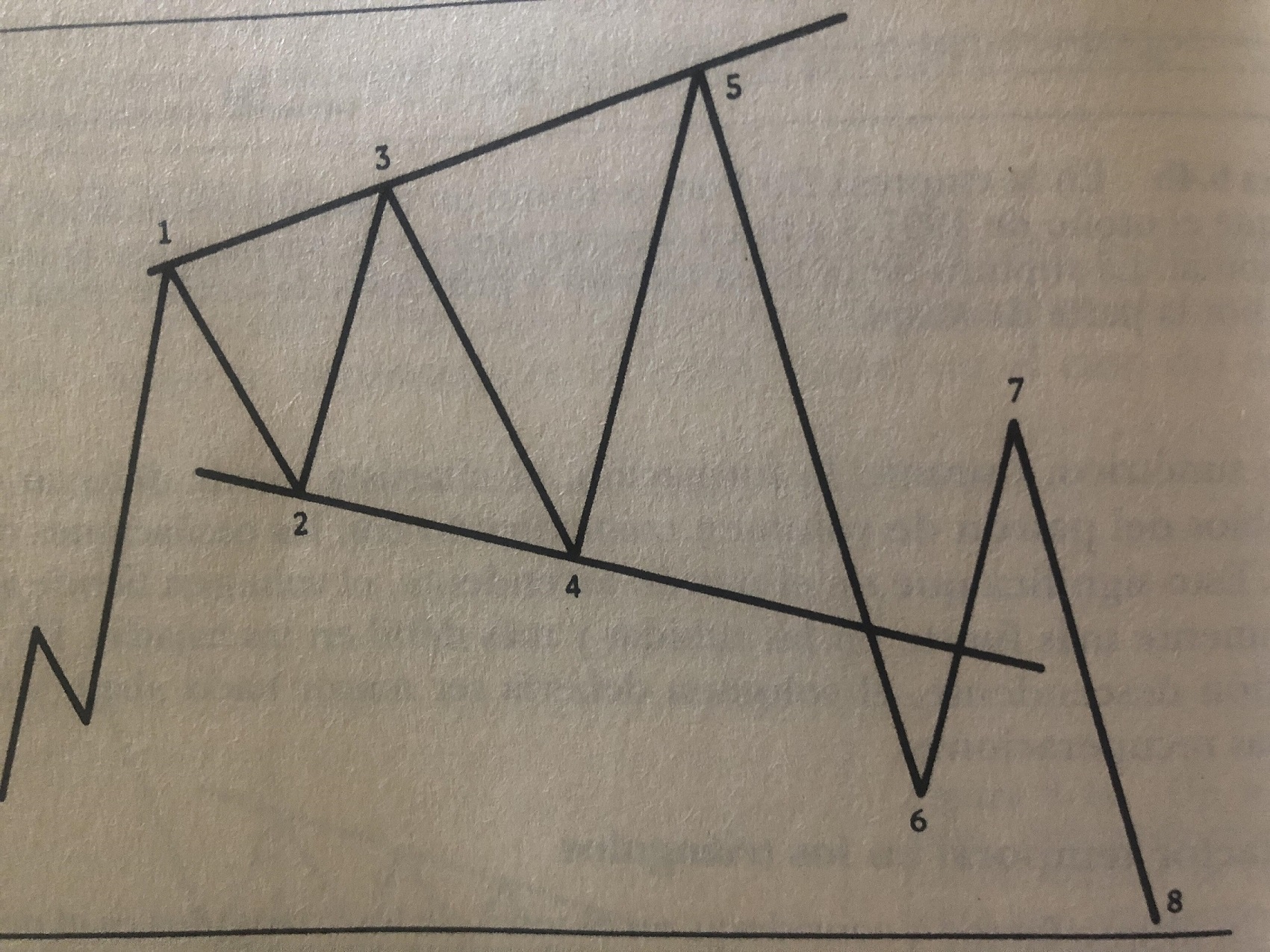 Supostamente ocorre no final de um bull market de relevo, identificando um mercado fora de controlo e instável e ao contrário dos triângulos o volume deve estar a crescer.