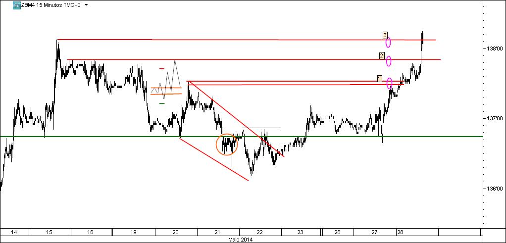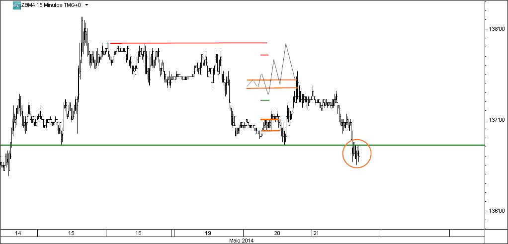 Para quem entrou na linha de frequência (lembre-se que esta linha começou a ser desenhada dia 14 de Maio) é imperioso colocar a stoploss no b/e. Como habitual, o target poderá ser a cl, a rl ou uma confluência de um máximo regional com uma delas.