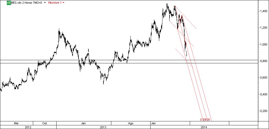 Gráfico 3: dando asas à imaginação, ao lado artístico da coisa, decidimos dividir o gap em metade e usar o princípio as above, so below. É visível o lugar que o preço poderá visitar, lugar esse que coincide com o lugar identificado no primeiro gráfico através de linhas horizontais, que aliás também coincide com a área abrangida pelo fork descendente e com as al-rl descendentes. Tudo a coincidir com uma zona/valor (0,80) que mencionei há um algum tempo. Momentos interessantes se aproximam.