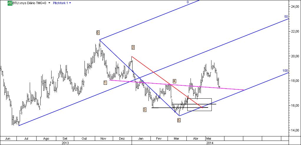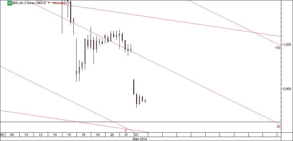 Fork descendente (não por si só, mas no contexto de um break de um swing) indicando provável caminho do preço.