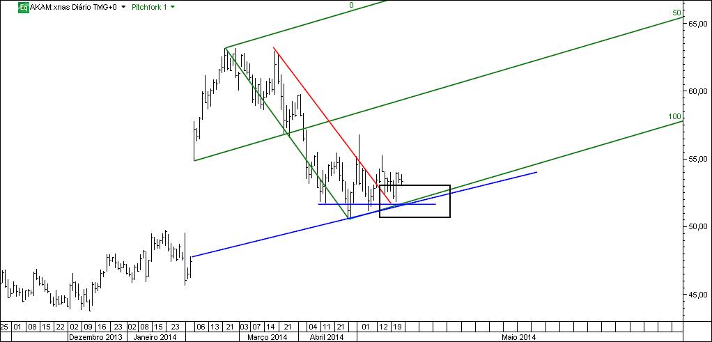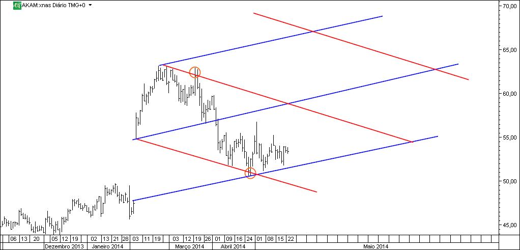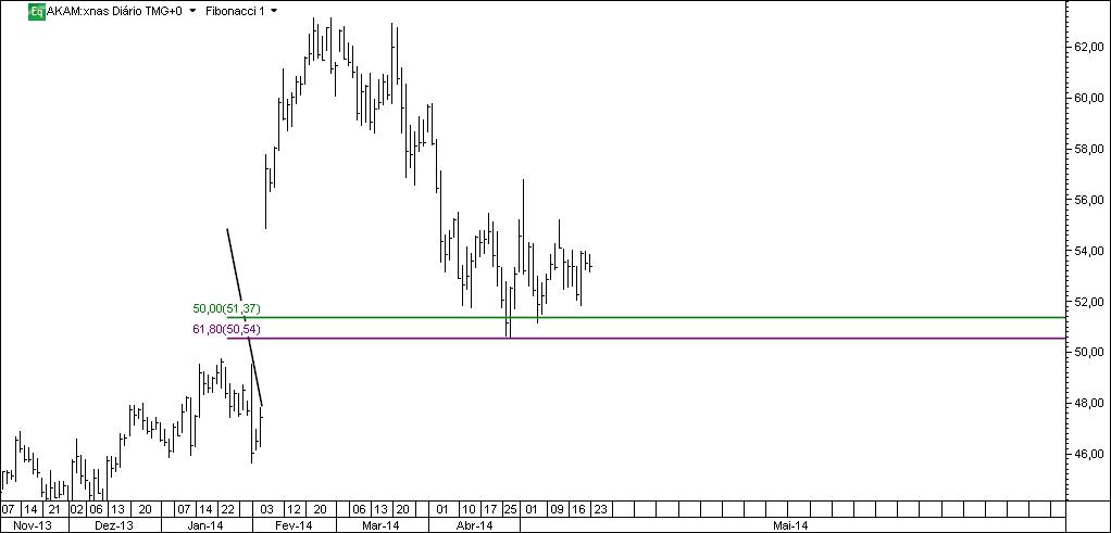 Tornou-se difícil acompanhar a akamai num gráfico de 30 m: o preço ficava todo apertadinho que dificilmente se conseguia ver o que se tem de ver. Passamos assim para um gráfico diário.