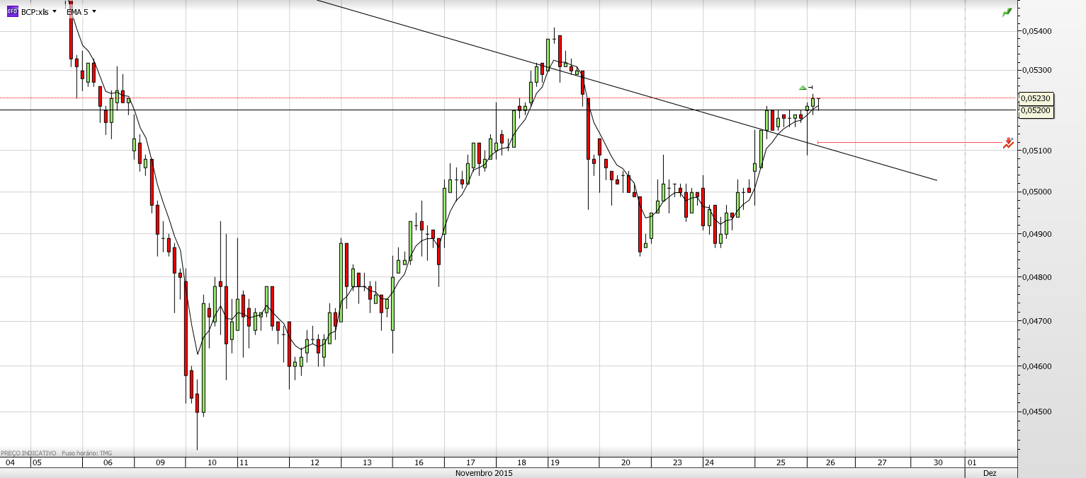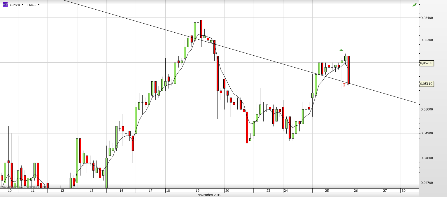 Hoje deixei uma ordem de compra de BCP, mais de um ano depois de ter tido posição no título, amanhã posso voltar a ter BCP... ainda assim será uma pequena bicada (caso chegue ao preço que deixei a ordem) com stop relativamente apertado, nos 4,80 cêntimos! Os sinais são ainda ténues e pouco fiáveis, por isso é só uma pequena bicada! O objetivo está um pouco abaixo dos 6 cêntimos... vamos lá ver se chego a entrar... e se não saio logo a seguir!