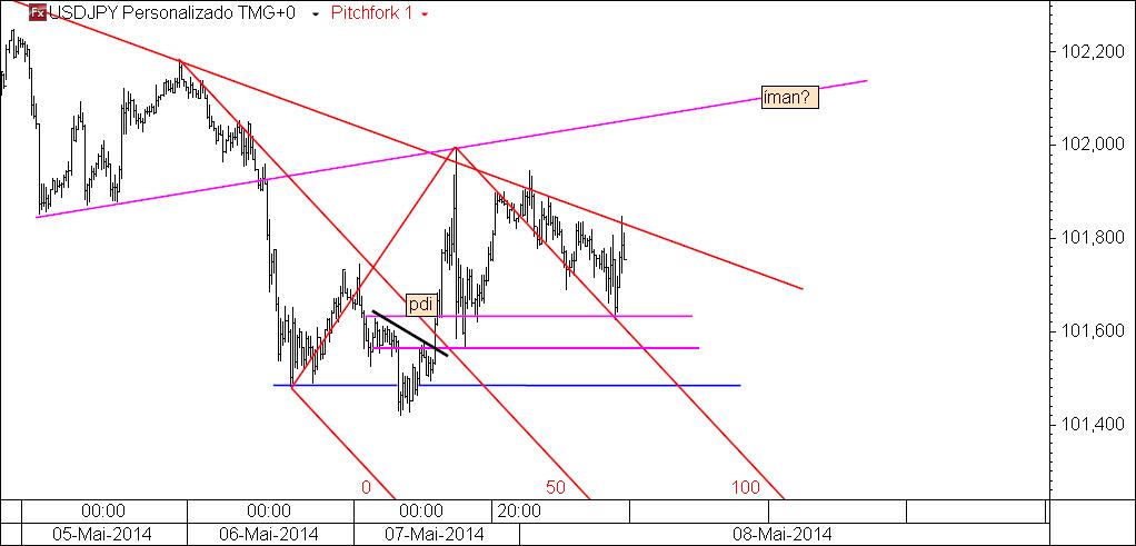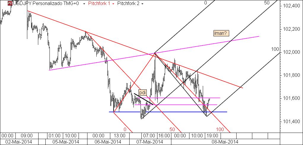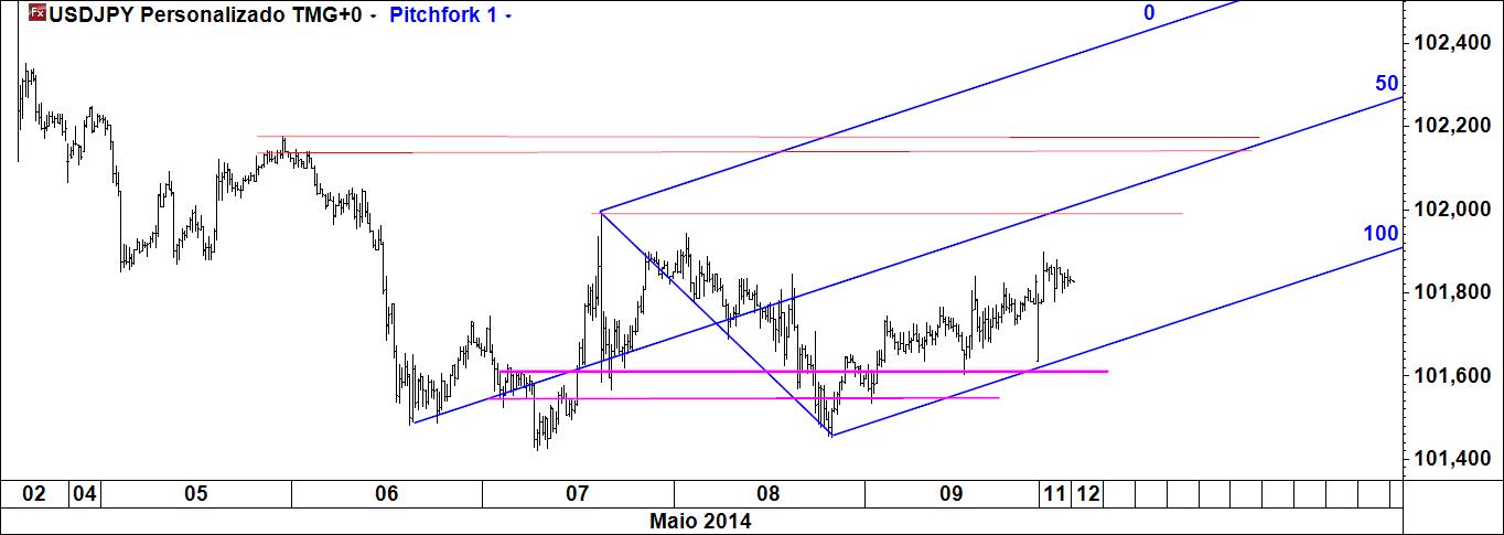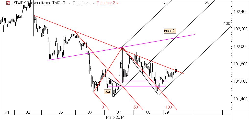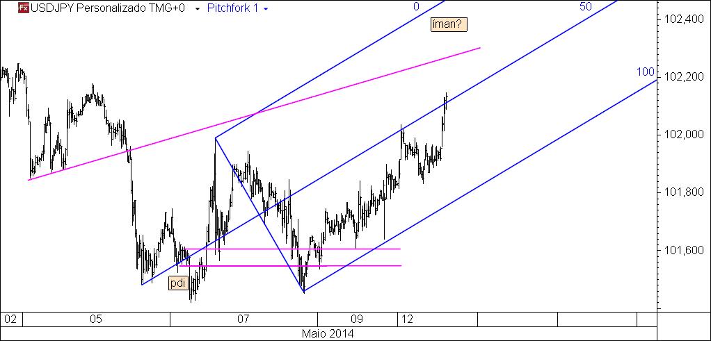 usdjpy 20 m: mantêm-se os targets, sem prejuízo de revisão para acomodá-los à evolução do preço (se as linhas nos mostram o caminho provável do preço, quanto mais tempo passar até que sejam atingidas maior terá de ser a subida, mantendo-se esta, como é evidente); estando o negócio positivo, é imperativo colapsar o risco de uma de duas maneiras: subir a stop para b/e ou colocá-la atrás de um swing relevante