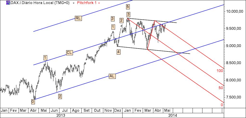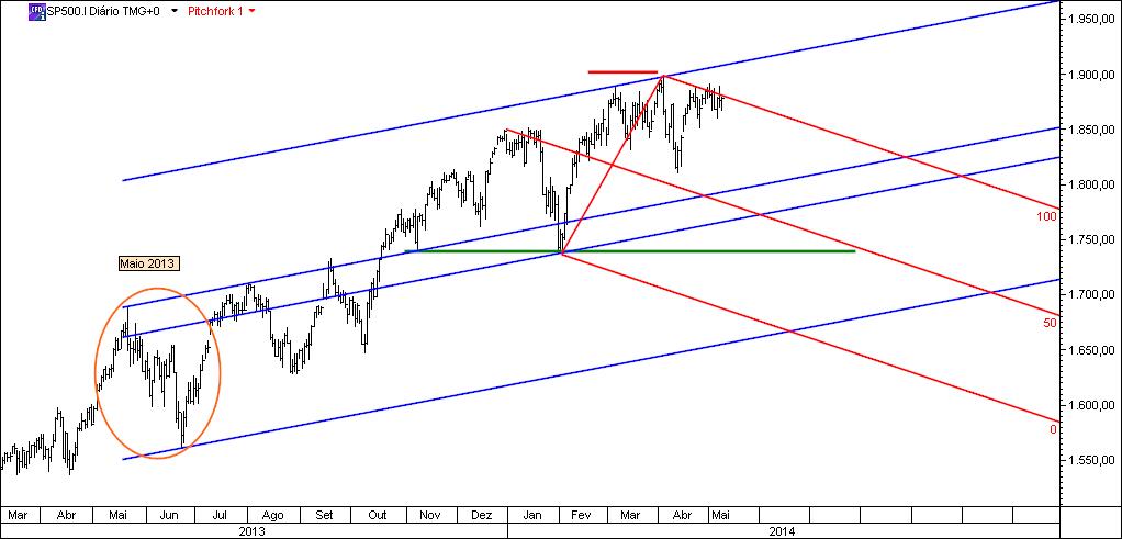 SP500: é necessário que não demore muito tempo no ataque ao máximo (acima do pivot c do fork); caso contrário, poderemos ter pelo menos uma reversão à média, que neste caso será dada pela zona de confluência bem visível no gráfico, por falha de swing high e "activação" do padrão "3 drives to the top". A título de curiosidade, veja-se o que sucedeu no mês de Maio de 2013. Fazendo um pouco de futurologia para o caso de se dar a correcção à média, a recente banhada (ver pivot b) poderá dar-nos protecção para uma oportunidade especulativa.