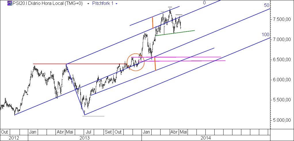 PSI20: sinais de perigo. Parece que alguém se esqueceu de apanhar o comboio, pelo que é necessário fazê-lo regressar a preços mais jeitosos: let´s ride the other side of the mountain! Caso este movimento se confirme, já sei onde me vou colocar para tentar apanhar uma "faca em queda". Também a título de curiosidade veja-se o que o índice fez em Maio de 2013: swing b-c do fork. Note-se que as paralelas deslizantes "captam" a amplitude deste swing. Este cenário de queda sairá inválido se o preço recapturar a linha média superior do fork.