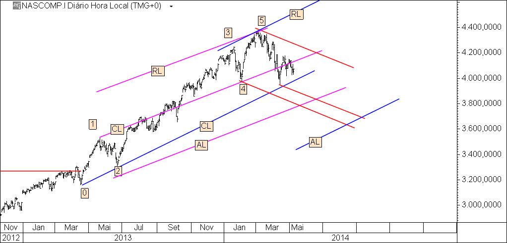 Nasdaq Composite: o mais adiantado na sua fase correctiva. Se as linhas p1-p4 e p0-p4nos der a center line, então saberemos onde passam as action e reaction lines. Também aqui Maio de 2013 pode ser uma referência a ter em conta (ver swing 1-2).