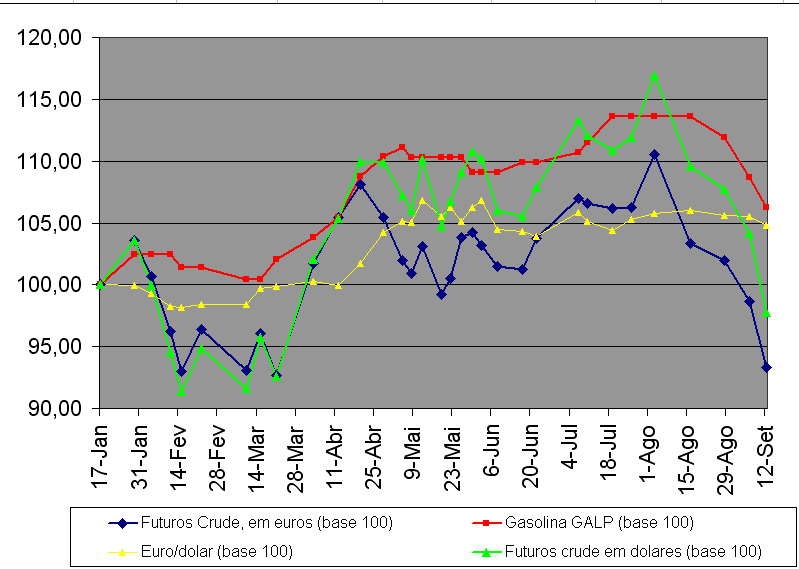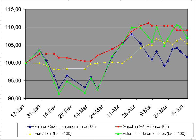 De qualquer forma, é importante assinalar que o site em questão apresenta a cotação do petróleo em USD e ao preço da gasolina em EUR, por isso a evolução dos valores de ambos os produtos não é directamente comparável sem ter em conta a evolução do EUR/USD, como aliás me chamaram a atenção quando comecei com esta compilação.