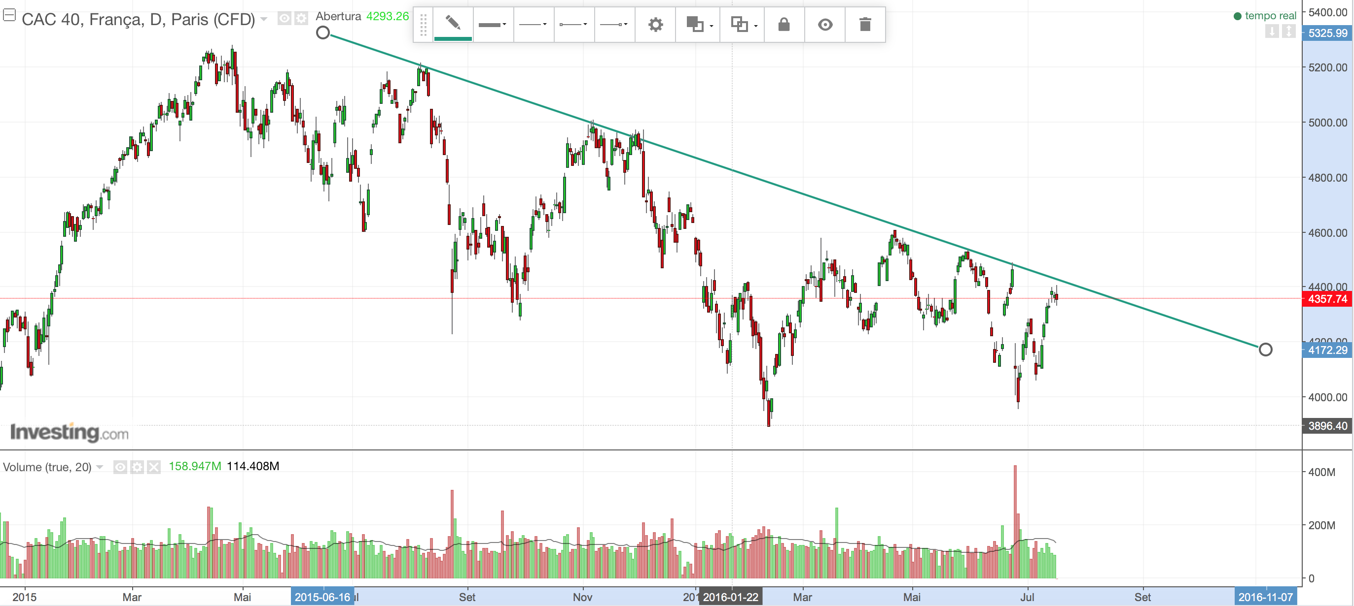 O preço gostou outrora da zona suporte, depois lá se decidiu pelos confrades curtos, e aqui estamos nós novamente nos 4300 (números redondos).