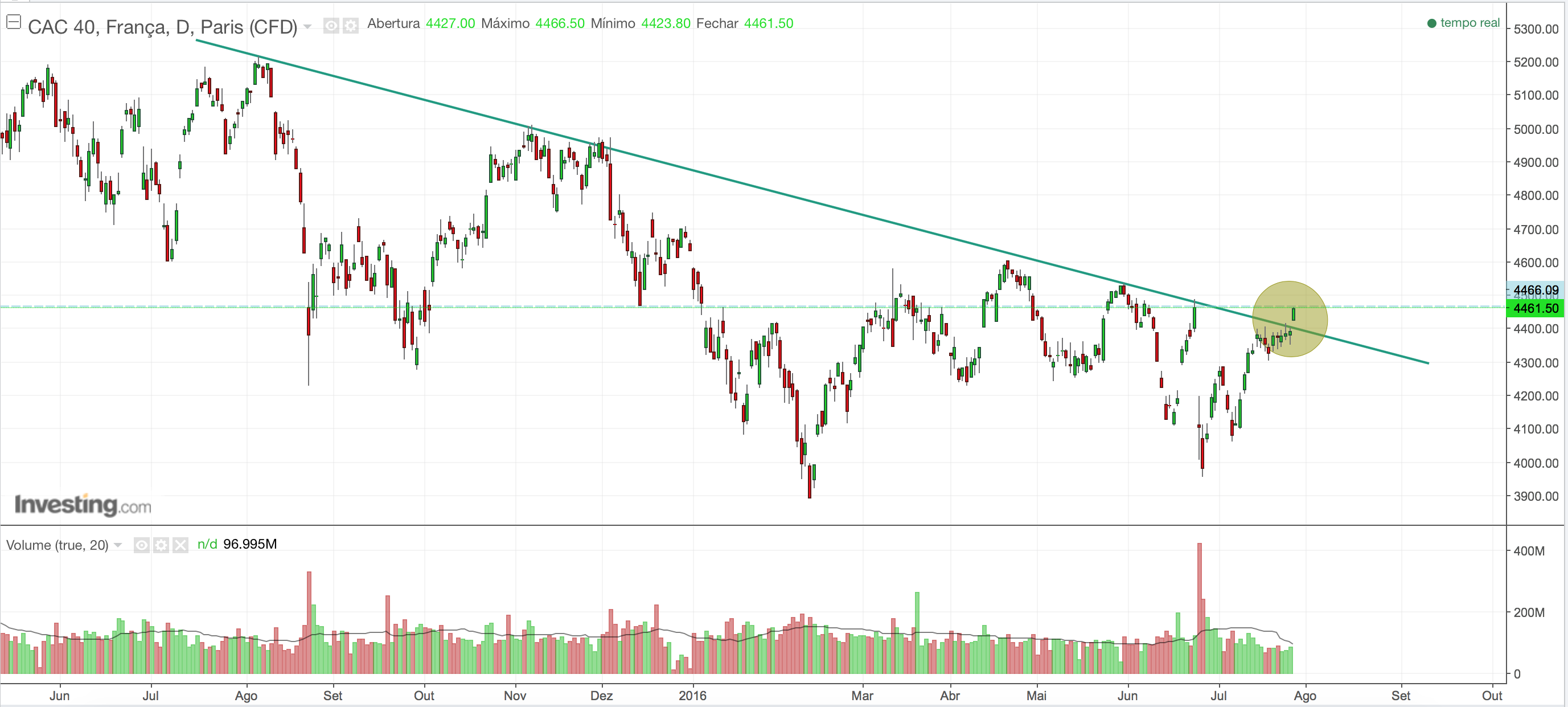 Quebra da linha de tendência descendente. Encontra-se numa resistência neste momento perto dos 4466, mas bom sinal para o CAC.