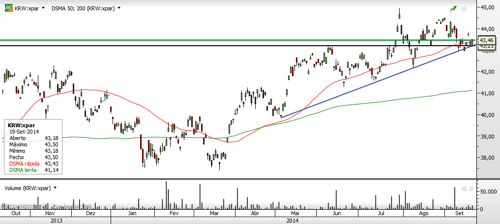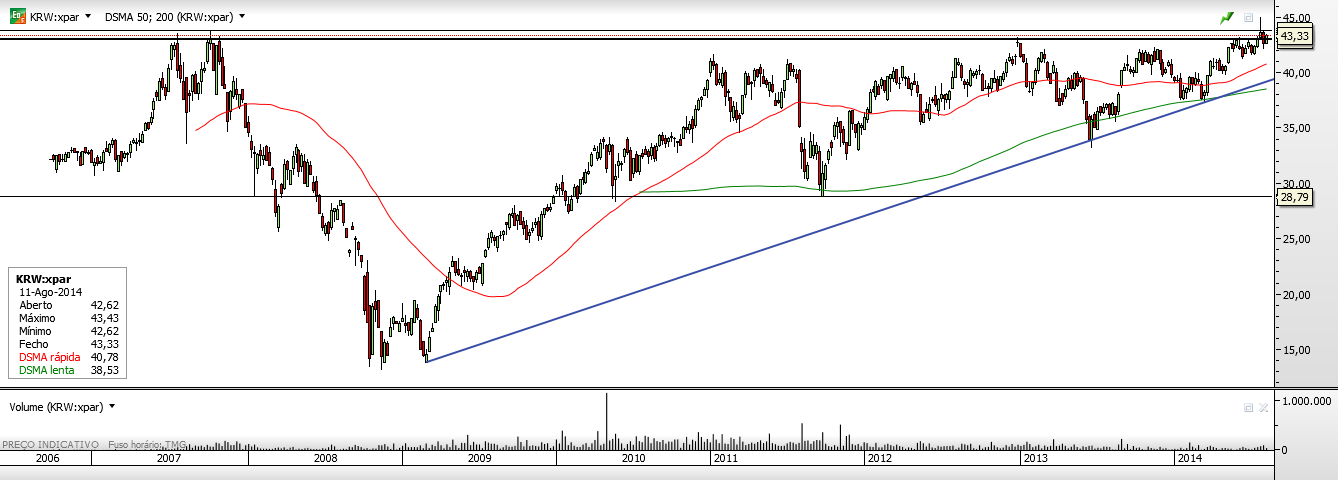 Korea - A negociar junto à LTa, aos níveis de entrada (linha verde). A quebra do suporte e da LTa indicarão sinal de fraqueza e deixará de fazer sentido esta posição que abri ao fazer novos máximos.