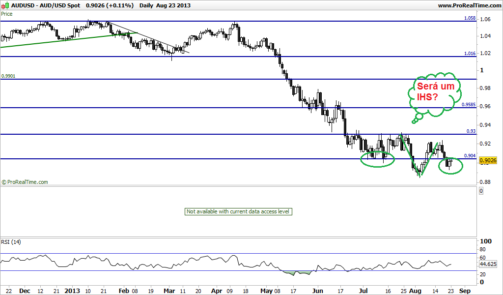 aud/usd - Depois de 5ª feira, confesso que fiquei um pouco confuso. 4ª feira foi dia de FOMC, o volume diário não foi nada fora do normal mas 5ª feira registou-se um volume anormalmente elevado sem que tal se traduzisse em movimentos amplos. Justificação ? Boa pergunta... O certo é que 6ª feira produziu um doji e sem ruptura da s/r de curto prazo a 0,9057. E como eu não acredito em H&S que não sejam os clássicos - neckline constituída por um(a) suporte(resistência) horizontal - pelo que, para já, vou ficar a aguardar por um sinal mais evidente, sobretudo do usd per si.