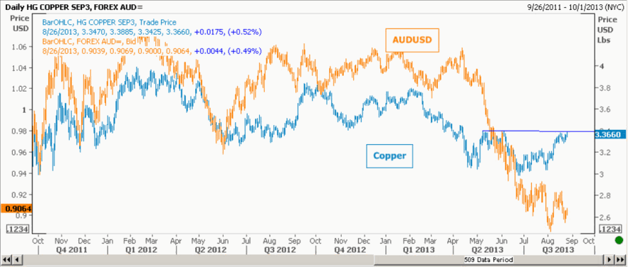 Relação entre o cobre e o audusd; correlacionados.
