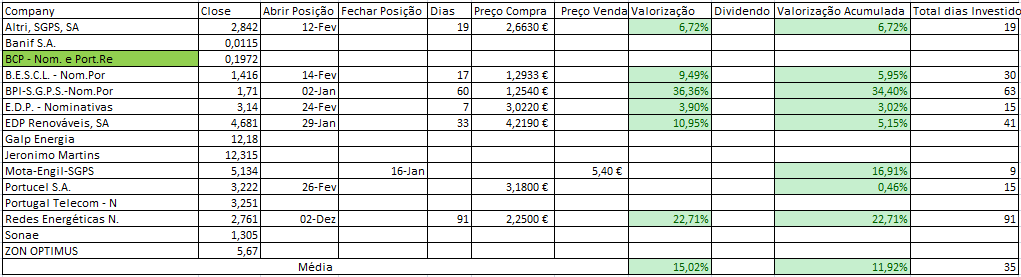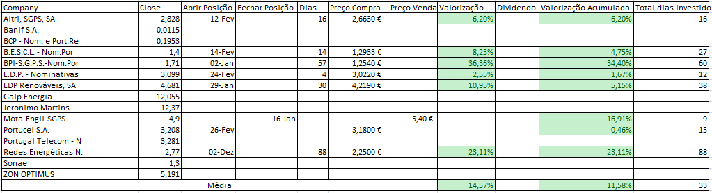 A carteira termina o primeiro trimestre com uma valorização de pouco mais de 18% (colocarei amanha, pois só amanha o mapa da Gobulling é actualizado com o ultimo dia, 28 de Fevereiro).