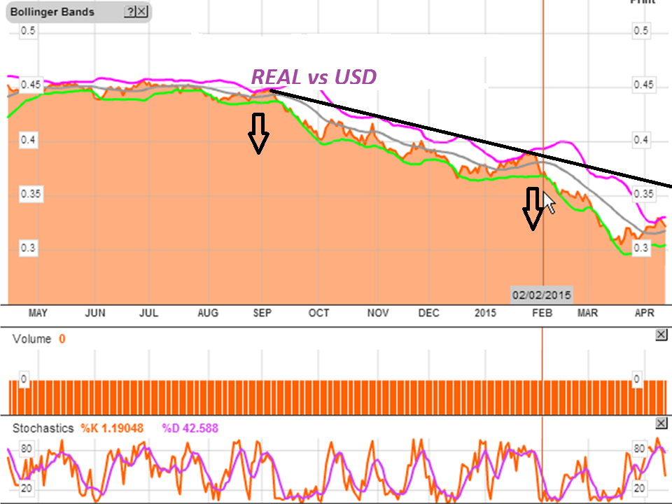 PTBR, o usd deverá voltar á tendência de longo prazo - i.e. valorizar-se, mas de uma forma cada vez mais suave, face ao real (anexo). O real deverá ter passado por um rebound devido a influxos temporários de capital (são Fundos norte Americanos que estão a comprar no Bovespa), mas rapidamente voltará o efeito da inflação brasileira, até ao fim da estagnação económica (deve durar até final deste 1º semestre).