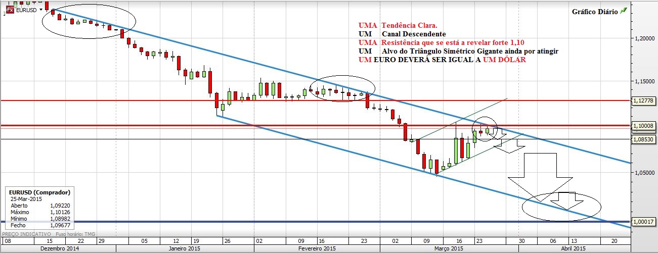 Deixo aqui a minha ideia a propósito do EURUSD, esse par sem igual e que continua na sua caminhada rumo à paridade... Depois de um natural ressalto, que serviu para aliviar os denominados indicadores e para convencer muitos de que o fundo estava feito, eis que o Ilustre Par se encontra num momento chave e, na minha modesta opinião, pronto para retomar a sua tendência. Curto em conformidade com a ideia exposta. Será importante que o Preço não quebre em alta os 1,10 e que também não feche nem abra por cima da LTD superior do canal.