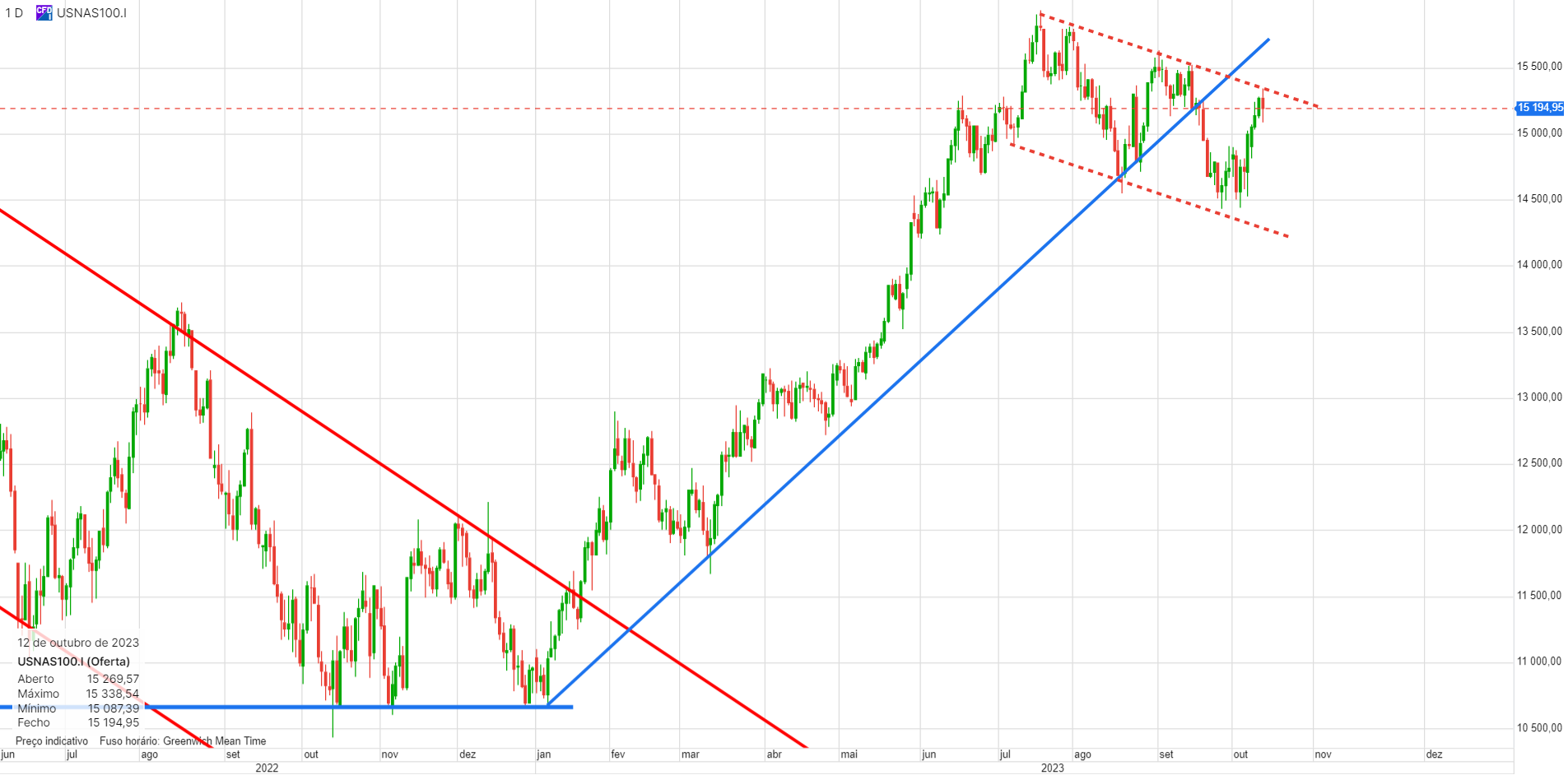 Atenção, que este canal, se olharmos para o último ano, pode ser entendido como uma bandeira de consolidação e nesse caso, uma quebra em alta, projetava o indice para novos máximos na zona dos 20.000. Mas para já, curtos, com stop fácil de colocar.