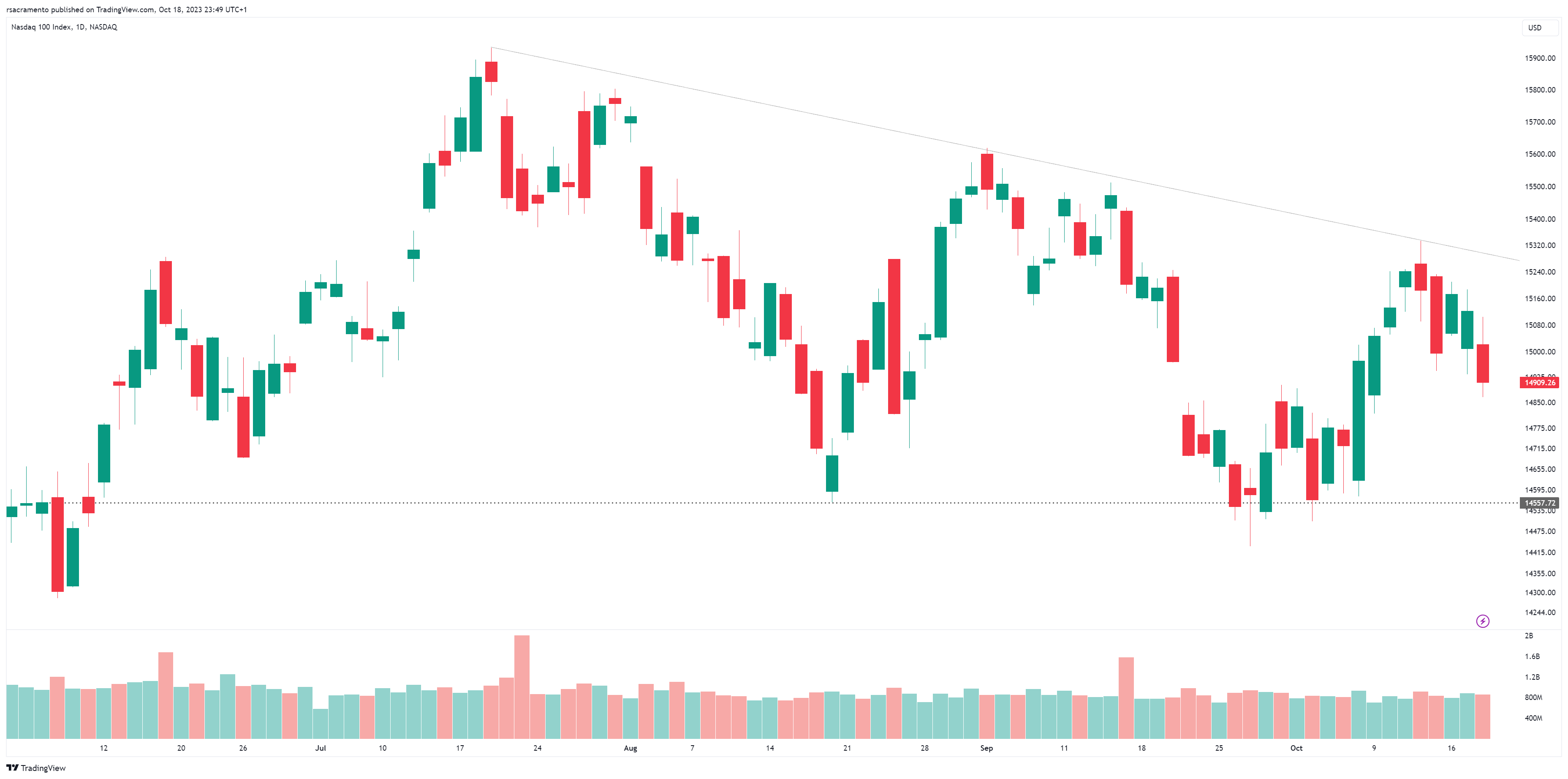 É a 4ª vez que o nasdaq testa estes valores e esta zona tem-se revelado um bom suporte. Penso que acabará por ceder e ir para perto dos 14000. Espero voltar a abrir curtos, ainda esta semana, 100 ou 150 pontos acima.
