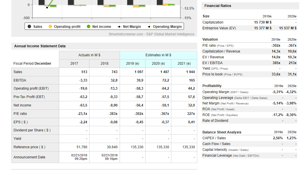 Começamos pelos aspectos fundamentais da empresa: No segundo trimestre de 2019 apresentou um crescimento das receitas estratosférico, de 287% YoY. Para o final do ano FY19, a empresa prevê um crescimento de receitas de 170% YoY. A previsão para o FCF/S é de -1.28% e a margem líquida de -5.65%. Aplicando a regra dos 40, temos 170-1.28= 168.72%, o que é mais do quádruplo dos 40 necessários para verificar a regra. Impressionante. A previsão dos analistas para os próximos três anos é a de um crescimento acumulado de vendas de 580.3%. Quanto aos lucros GAAP encontrei infomações divergentes. Enquanto na 4-traders, se prevêm lucros GAAP já em 2020, na Motley Fool falam apenas em 2024. Uma grande diferença.