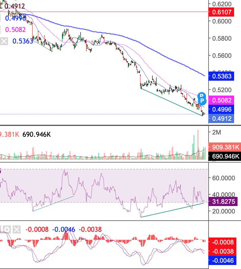 No horário temos novamente divergência no RSI e aumento de volume na aproximação ao fundo: