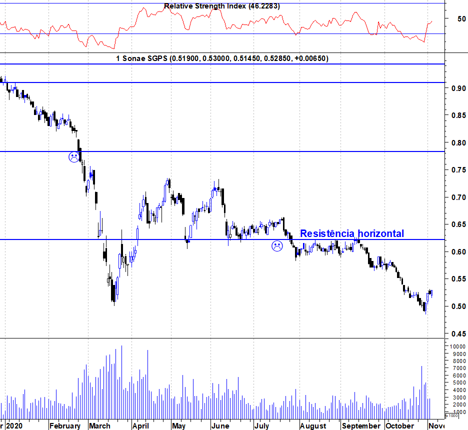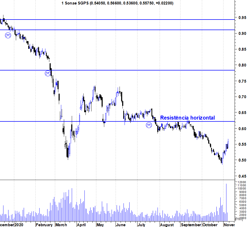 Deixo o gráfico actualizado da Sonae SGPS num grande dia para as Bolsas mundiais. A Sonae é um excelente indicador do PSI e está ali bem clara a resistência que tem que quebrar para dar sinal da inversão da tendência de médio e longo prazo.