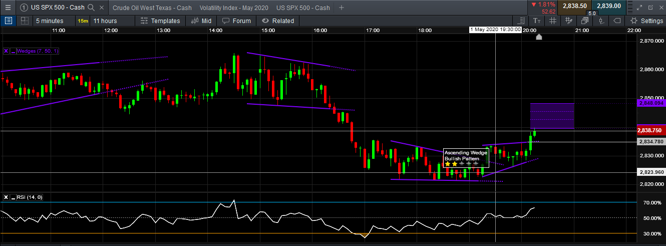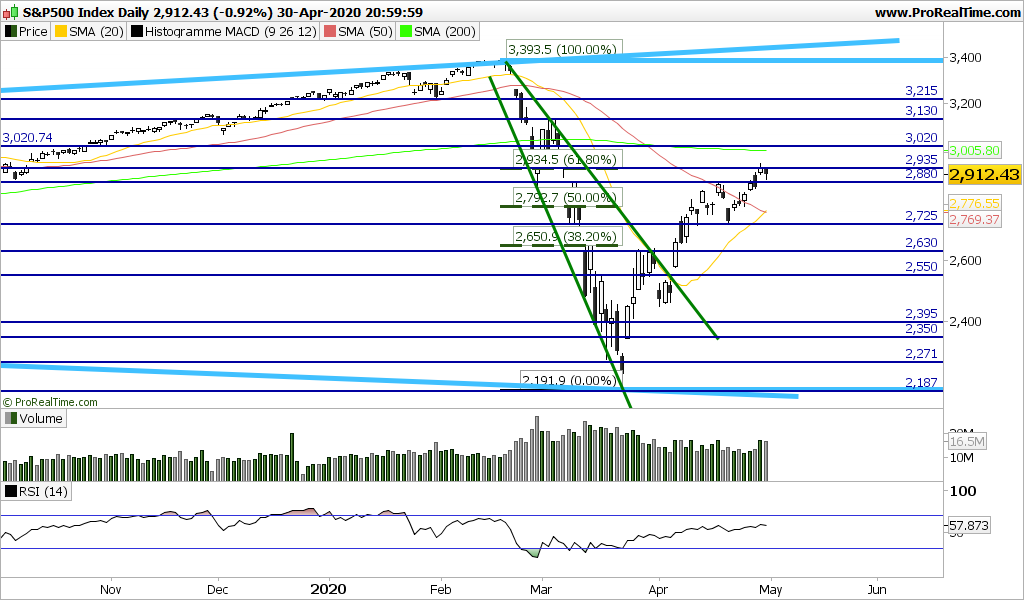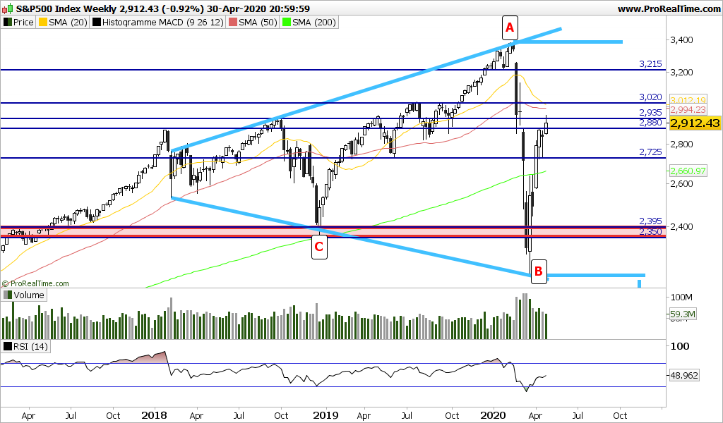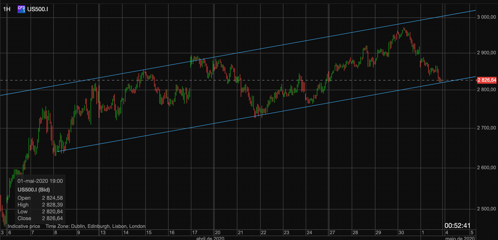 B) Após o melhor abril em 82 anos no S&P500 - com valorização alucinante de 12,7%, especulo agora no "teste obrigatório" AOS 2736,60 (SF1), embora ainda não consiga determinar se vai testar os lows de Março nos 2237, e dada a incerteza sobre a latitude e o timing da correção, entrei com SPXU em vez de CF.
