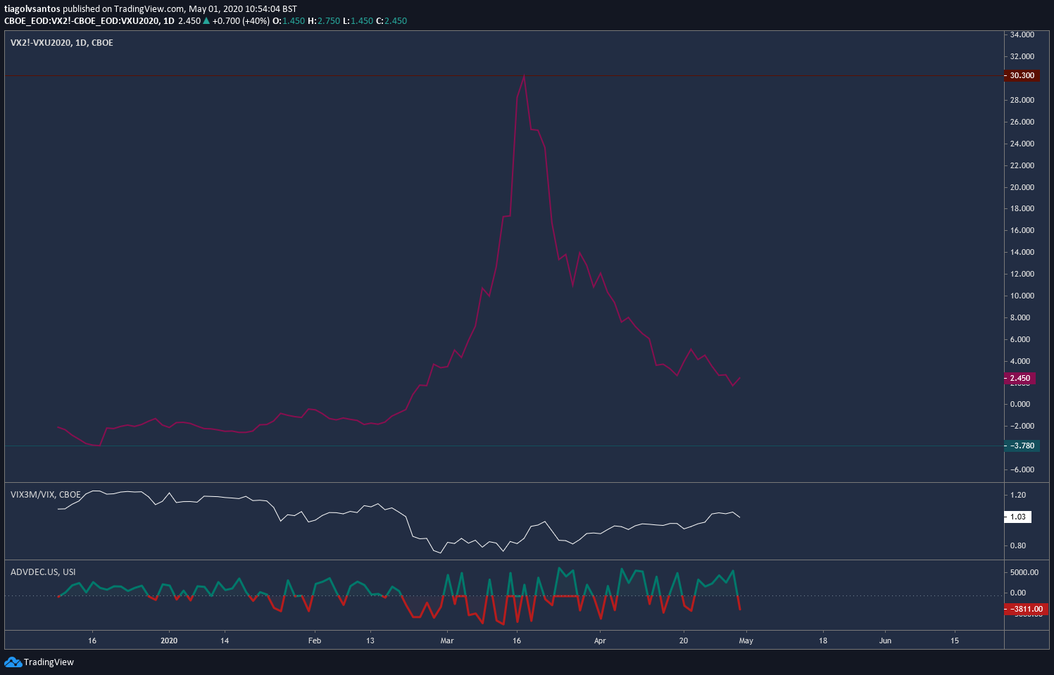 De notar o spread entre VIX e VSTOXX, quando o mesmo cruza o zero por norma há grandes movimentos.