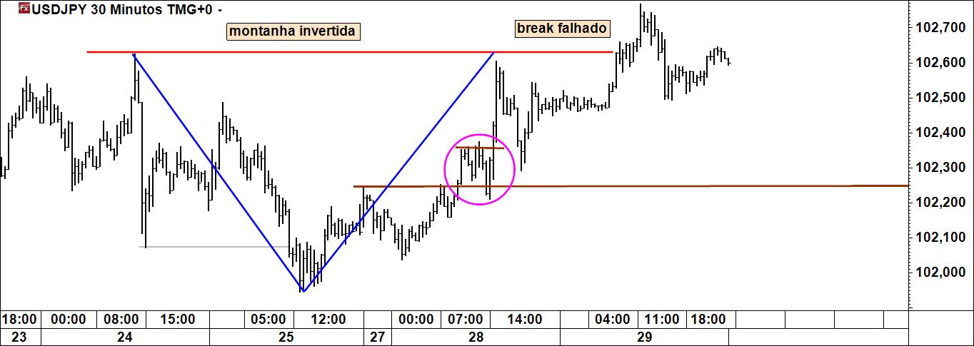 No tópico do bes falei em montanhas, aqui falo em montanha invertida. O breakout falhado dá origem ao recuo do preço até a um nível onde compradores poderão aparecer (mais um comportamento que o mercado não se cansa de repetir: veja-se por exemplo o recente eurcad). Continuo a chamar a atenção para o local onde terá sido marcado território.