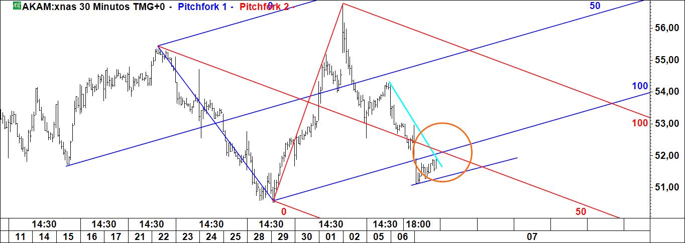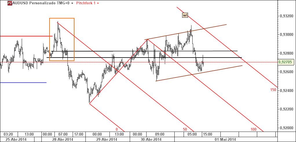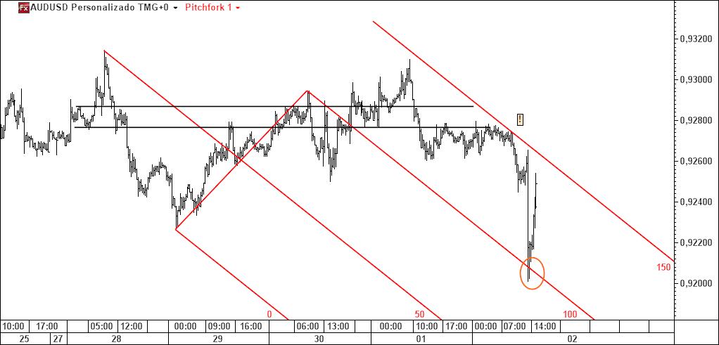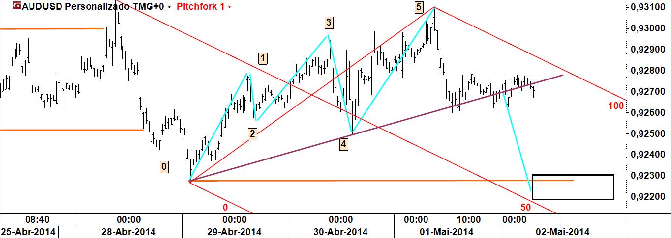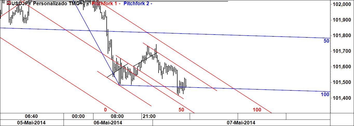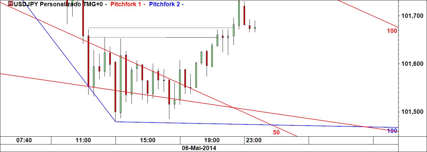 - a linha 1-4 poderá ser atingida caso se verifique movimento ascendente (actuará pois como íman do preço), sendo que Linda B. Raschke tem um método para especular com esta linha; note-se que é paralela à linha média do fork (daí paralela deslizante);
