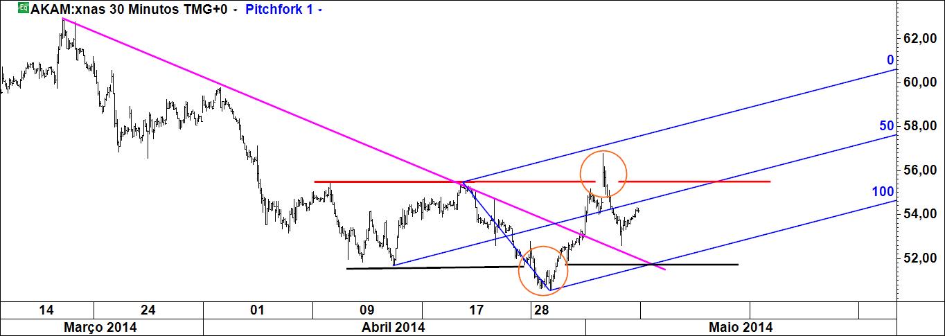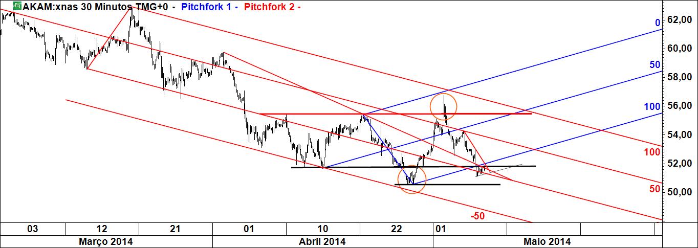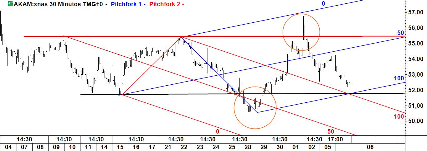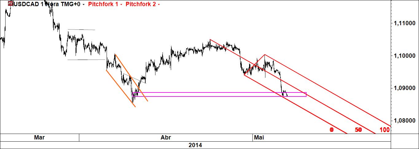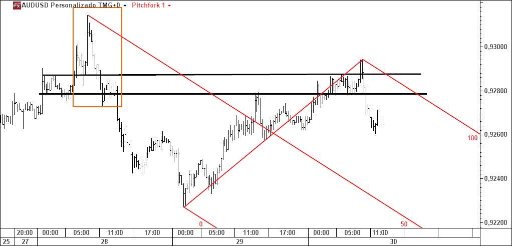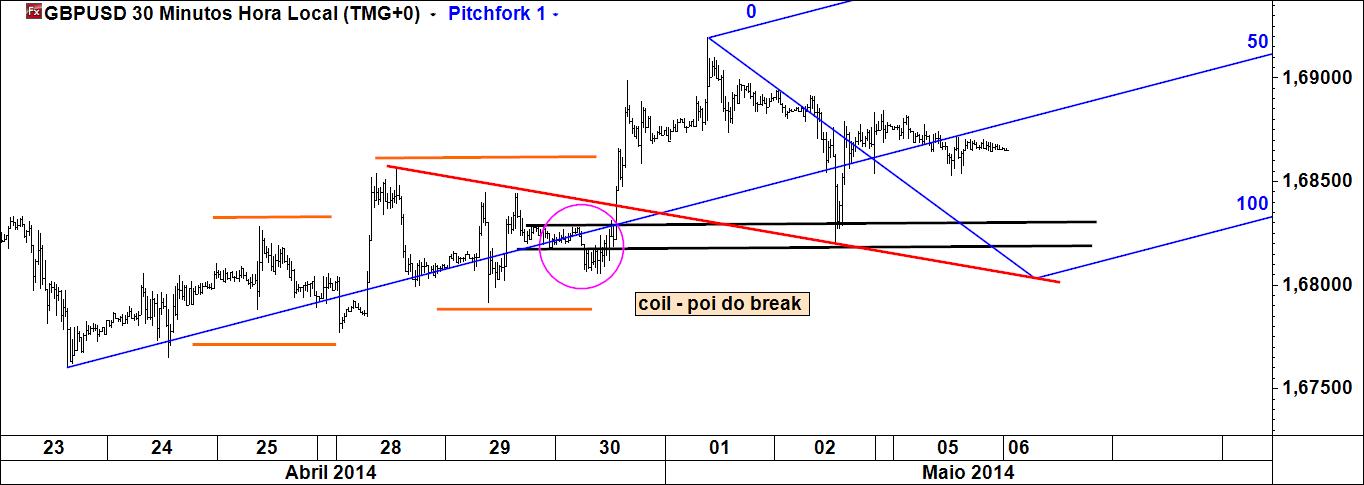 - a linha 1-4 poderá ser atingida caso se verifique movimento ascendente (actuará pois como íman do preço), sendo que Linda B. Raschke tem um método para especular com esta linha; note-se que é paralela à linha média do fork (daí paralela deslizante);