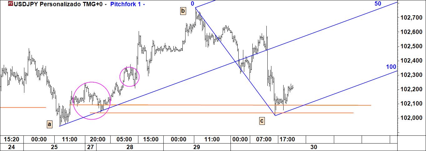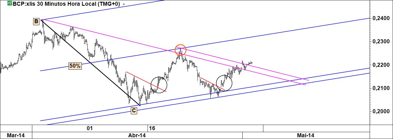 aproveitamento de eventual recuo do preço até à linha média inferior do fork azul, com stop abaixo do pivot c e target na linha de reacção