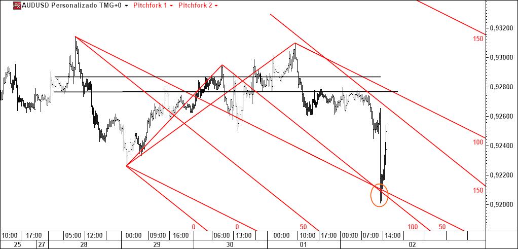 audusd 20 m: target atingido; sequência de 3 gráficos para mostrar que ambos os forks apontavam para o mesmo local
