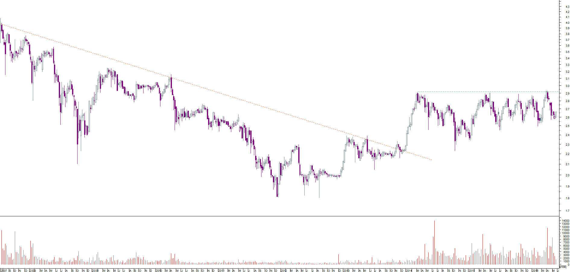 Esta ação é das mais difíceis de analisar, para mim. Não consigo identificar suportes (ou resistências) óbvios entre os que existem à volta dos 2.5€ e 2.8€.