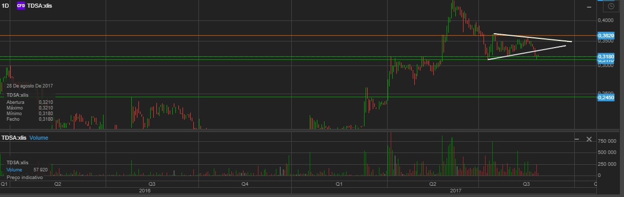 Considero que pode ir até aos 0,315€. Tal como a Impresa veio fechar o GAP dos 0,30€, a Teixeira Duarte deve ir testar o anterior suporte na zona dos 0,31€-0,315€. Não acredito que passe à primeira mas acredito numa ida lá.