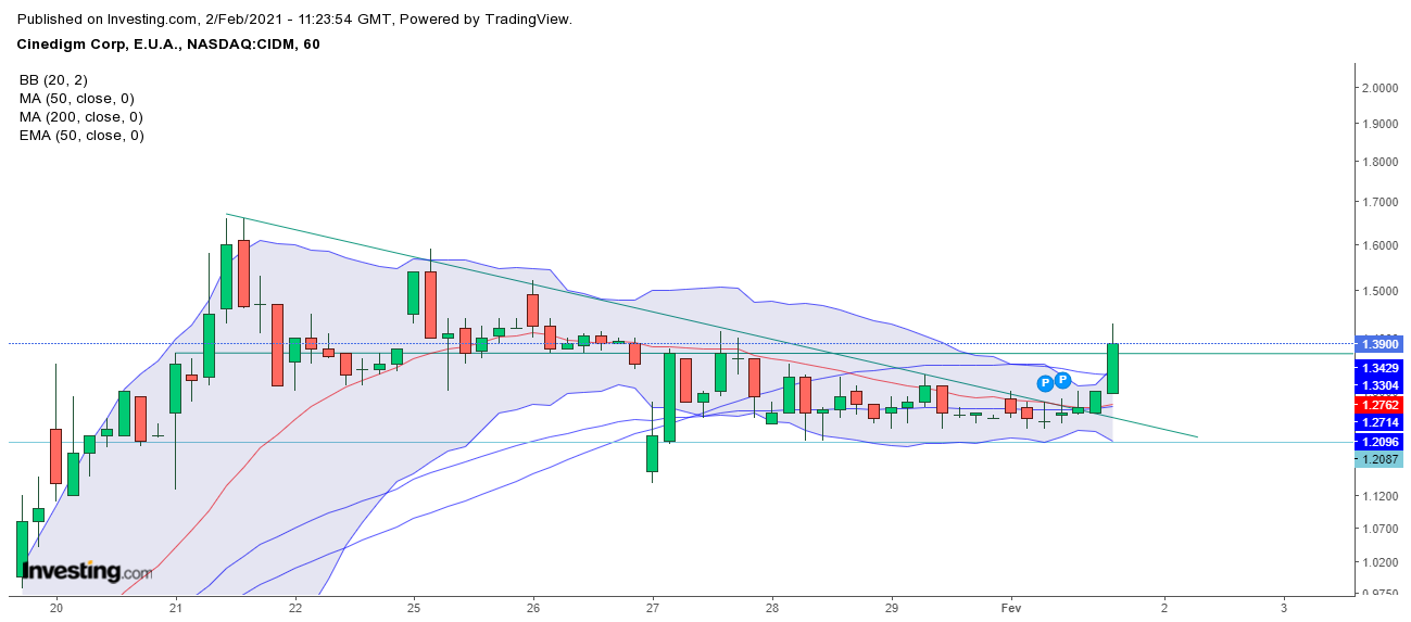 Um flop a Cinedigm na zona dos 1,33-1,35, parece cimento (mas tem uma consolidação boa)......a IBIO está a respirar antes de tentar chegar à zona dos 1,95.....